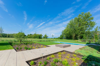 Les aménagements paysagers, réalisés avec Les Mauvaises Herbes, structurent l’ensemble avec finesse, soutenus par un système d’arrosage automatique pour un entretien simplifié.