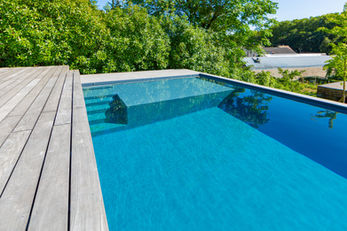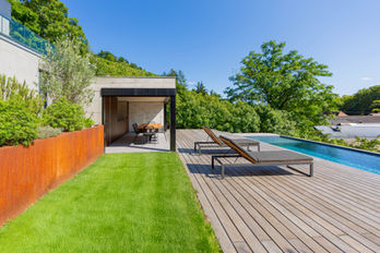 Dans son prolongement, la piscine vient dessiner une parenthèse de fraîcheur au milieu des vignes. Ses lignes franches — 12 x 4 mètres en béton, habillées d’une membrane armée Extreme Volcano et bordées de margelles en grès cérame — s’intègrent avec justesse dans le paysage. Volet immergé, pompe à chaleur, électrolyse au sel et filtration à sable assurent un confort discret, au service de la détente.